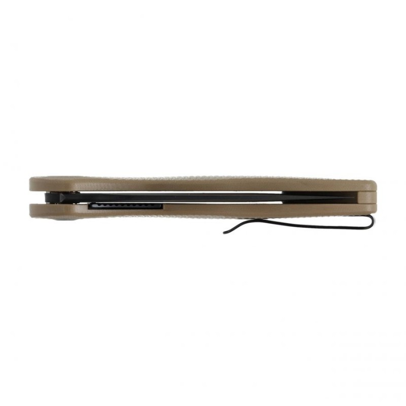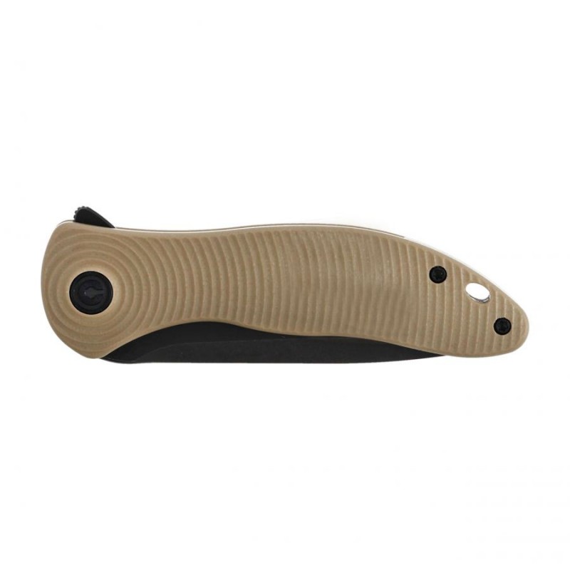 Okładziny rękojeści wykonano z beżowego G10 – kompozytu z włókna szklanego i syntetycznej żywicy, lekkiego i niepodatnego na uszkodzenia mechaniczne. Wygładzone krawędzie okładzin poprawiają pewność uchwytu i sprawiają, że nóż dobrze leży w dłoni.