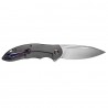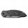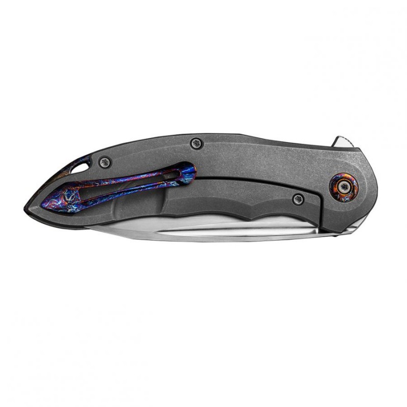 Głownia noża wykończono ręcznie elegancką techniką satynowania. Wydatny brzuch zwiększa długość krawędzi tnącej, co wpływa na efektywność i płynność cięcia. Grubość klingi 3,2 mm zapewnia wysoką wytrzymałość, podczas gdy wysoki, płaski szlif nadaje doskonałą geometrię krawędzi tnącej oraz wydajność cięcia. Ceramiczne łożyska kulkowe wspomagają otwarcie ostrza za pomocą płetwy flippera, pełniącej po otwarciu ostrza funkcję jelca zabezpieczającego dłoń przed zsunięciem się na ostrze. Klinga jest blokowana monolityczną blokadą frame-lock ze stalową wkładką zabezpieczającą przed wycieraniem czoła blokady. Okładziny noża wykonano z anodyzowanego na szaro tytanu z karbonowymi wkładkami. Konturowanie okładzin eliminuje ostre krawędzie i zwiększa wygodę użytkowania noża. Okładziny połączono ze sobą przy pomocy tytanowego backspacera. Matowa tekstura powierzchni poprawia pewność uchwytu. Tytanowy jednopozycyjny klips z tytanu, umożliwia przenoszenie noża w pozycji tip-up (czubkiem do góry).
