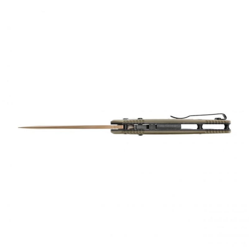 Szeroką klingę drop-point o długości 96 mm, pokryto powłoką cerakote w kolorystyce Flat Earth, który chroni przed drobnymi zarysowaniami i podkreśla taktyczny charakter noża. Klinga ma mocny sztych i szlif płaski, co gwarantuje płynne cięcie oraz łatwą penetrację. Głownia w najszerszym miejscu ma aż 3,5 mm grubości. Tylny odcinek grzbietu podniesiono i wykonano na nim poprzeczne frezy, pozwalającą na stabilne oparcie palca podczas pracy. Takie parametry gwarantują funkcjonalność i wytrzymałość noże oraz powodują, że może być wykorzystywany do wymagających zadań.