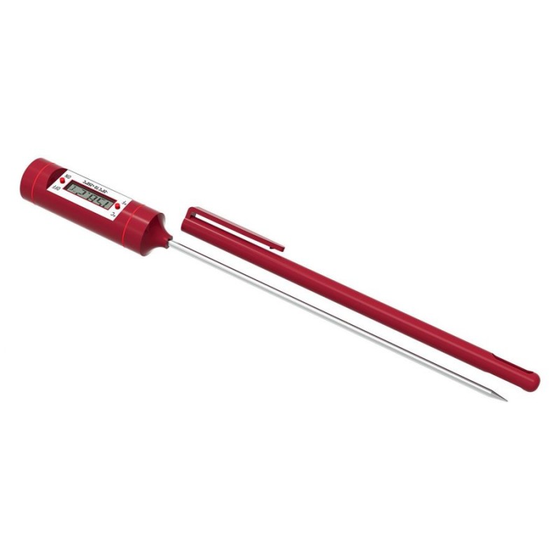Uwaga! Termometr ma sondę o długości 15 cm z czujka termiczną umieszczona na odcinku między 5-10 mm od strony zakończenia. Podczas pomiaru sonda należy umieścić w najgrubszej części potrawy/ mięsa, z daleka od kości.