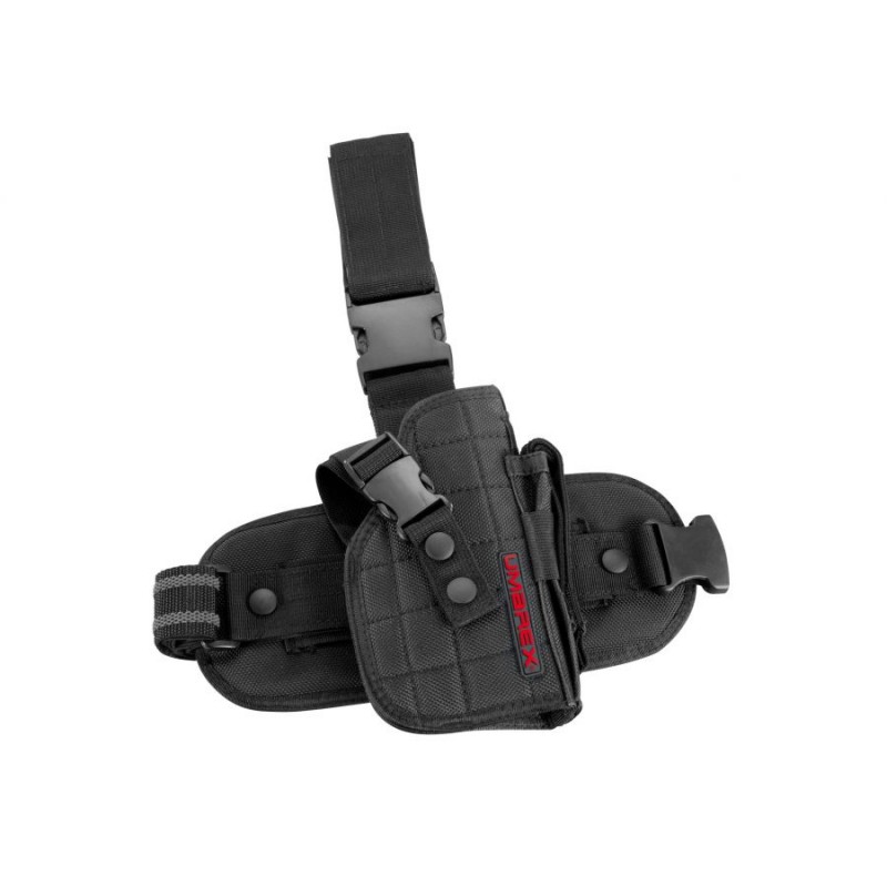 Kabura udowa Umarex UTG to uniwersalne rozwiązanie, umożliwiające przenoszenie pistoletu o różnej wielkości wraz z zapasowym magazynkiem. Wersja dla praworęcznych.