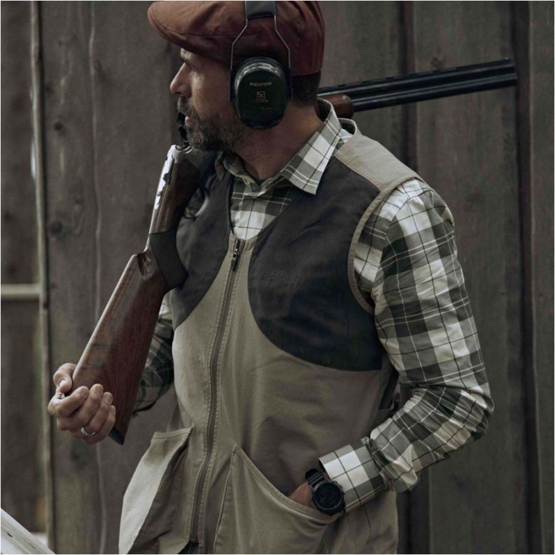 Lekka kamizelka Chevalier Gate Shooting Vest może być noszona bezpośrednio na koszulę i sweter. Wślizgi kamizelki obszyto zamszem Alcantara, co pozwala na stabilne oparcia kolby podczas strzału. Zewnętrzne kieszenie przednie mają regulację pojemności (za pomocą napa) i pozwalają na przenoszenie dużego zapasu amunicji. Wewnętrzną kieszeń (zapinaną na zamek) oraz potnik wykonano z tkaniny bawełnianej o kratkowanym deseniu. Kamizelka jest regulowana w talii za pomocą patek zapinanych na napy.