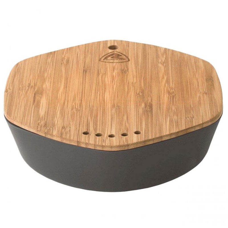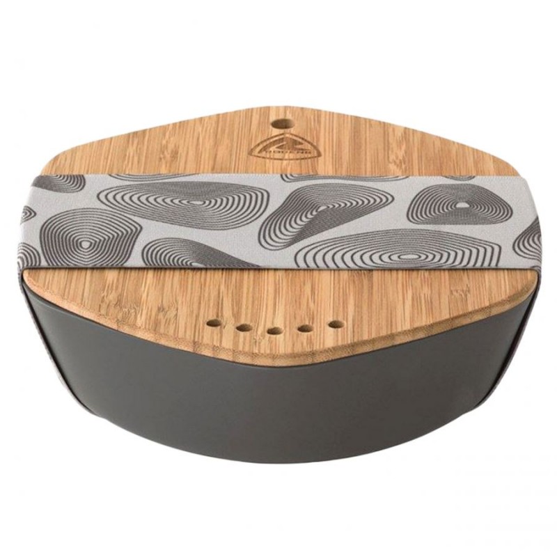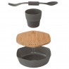 W komplecie naczyń Leaf Meal Kit znajdziemy miskę, kubek, łyżeczkę, widelec oraz bambusową pokrywkę. Niewielkie wymiary oraz prostota tego zestawu nie odbierają mu jednak funkcjonalności - pokrywa może stać się deską do krojenia lub cedzakiem, dzięki kilku otworom znajdującym się na jej powierzchni.