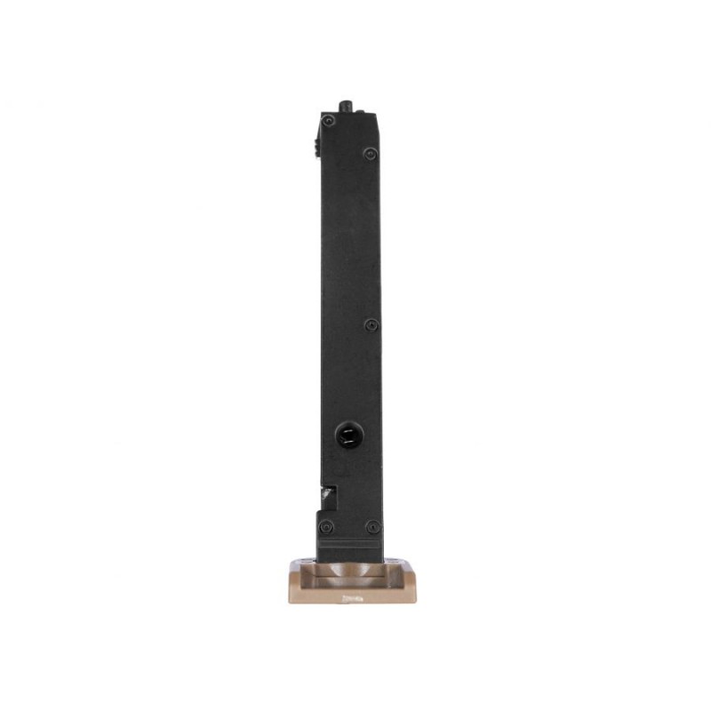 Korpus magazynka jest metalowy, z polimeru wykonano stopkę oraz blokowany podajnik kulek. Wewnątrz magazynka mieści 19 śrutów BB's.