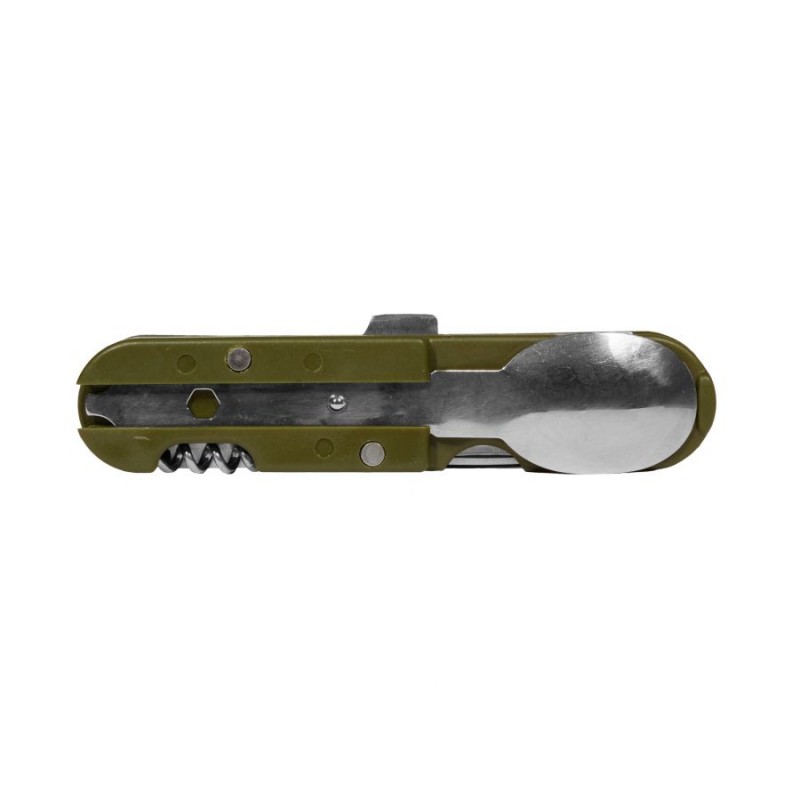 Niezbędnik ma modułową konstrukcję przypominającą szwajcarski scyzoryk, z tą jednak różnicą, że wybrane narzędzia można odłączyć od szkieletu i używać osobno. Niezbędnik MFH ma wytrzymały szkielet z polimeru, w którym osadzono 5 narzędzi najbardziej przydatnych podczas outdoorowej aktywności. Wszystkie narzędzia niezbędnika wykonano z wysokiej jakości stali nierdzewnej, odpornej na korozję, przenoszenie zapachów i odkształcenia. Widelec i łyżkę zamocowano w zewnętrznych prowadnicach rękojeści, dzięki czemu dostęp do nich jest szybki i wygodny. Do przenoszenia zestawu otrzymujemy etui z wytrzymałego nylonu, wyposażone w szlufkę na pas oraz klapkę zamykaną na rzep. Ten funkcjonalny dodatek sprawia, że niezbędnik będzie w razie potrzeby cały czas w zasięgu ręki.