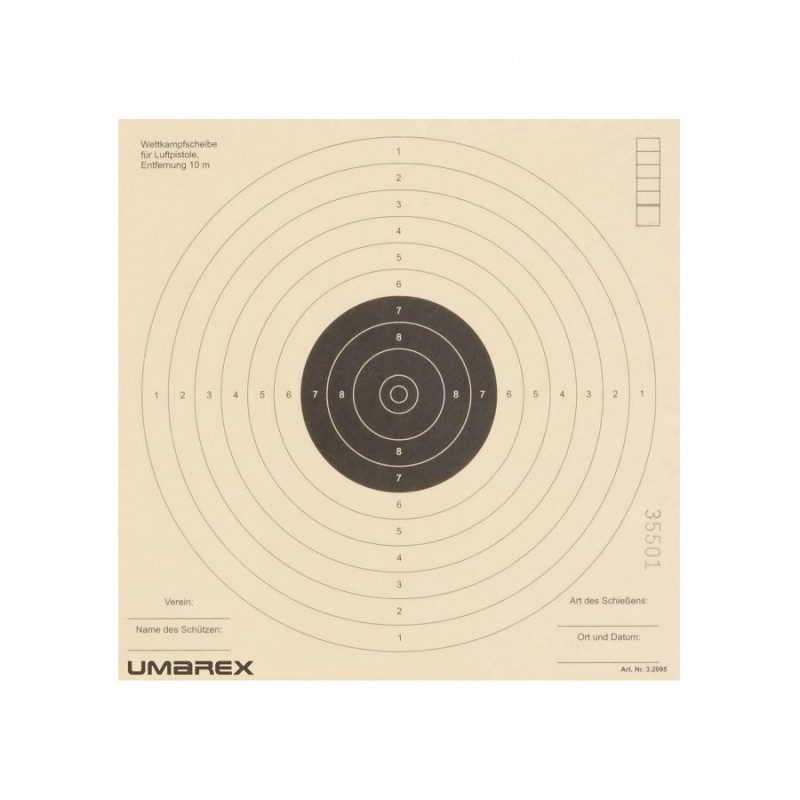 Tarcze papierowe Umarex 17 × 17 to zestaw papierowych tarcz przeznaczonych do treningu strzeleckiego z bronią pneumatyczną. Nadrukowane okręgi i cyfry są dobrze widoczne. Na każdej tarczy umieszczono ponadto tabelkę ułatwiającą zliczanie punktów, oraz miejsce na informacje o zawodniku.