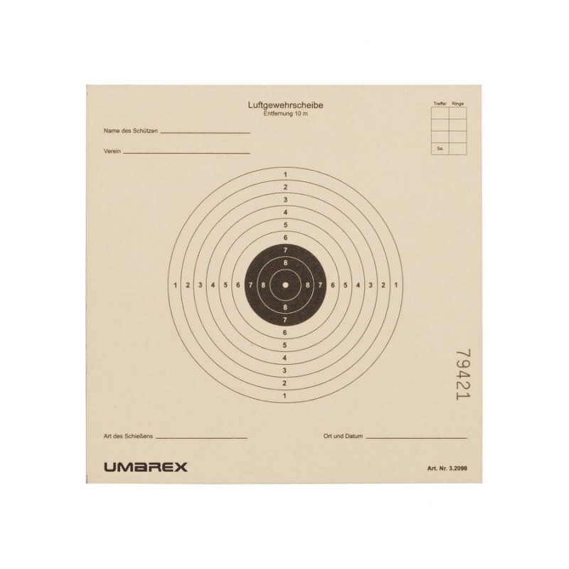 Tarcze papierowe Umarex 14 × 14 to zestaw papierowych tarcz przeznaczonych do treningu strzeleckiego z bronią pneumatyczną. Nadrukowane okręgi i cyfry są dobrze widoczne. Na każdej tarczy umieszczono ponadto tabelkę ułatwiającą zliczanie punktów, oraz miejsce na informacje o zawodniku.