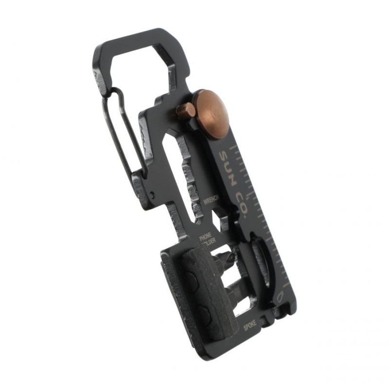 Karabińczyk ComboDriver Carabiner to praktyczny multitool zawierający bity krzyżowe i płaskie, klucze płaskie w czterech rozmiarach, dwa klucze do szprych, klucz motylkowy, dźwignię, linijkę z calową podziałką oraz otwieracz do butelek.