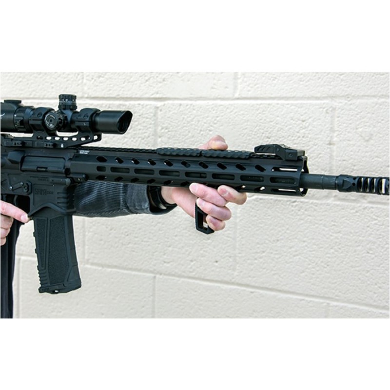 Chwyt pionowy to jeden z najczęściej stosowanych dodatków do karabinków, który zwiększa kontrolę nad bronią oraz ułatwia manewrowanie nią. Chwyt Leapers Super Slim M-LOK wykonano z aluminium lotniczego 6061-T6 i wykończono techniką anodowania o dużej odporności na ścieranie. Powierzchnię metalu poddano moletowaniu, dzięki czemu chwyt nie wyślizguje się nawet z mokrej lub spoconej dłoni. Chwyt ma lekką szkieletową konstrukcję oraz obustronne ząbkowanie, dlatego można go mocować na broni w pozycji odpowiadającej naszym potrzebom. Niski i wąski profil zapewnia wygodny chwyt broni bez względu na wielkość dłoni oraz sposobu jej trzymania. Rączka przystosowana jest do montażu na łożu M-LOK. W komplecie śruba montażowa oraz klucz imbusowy.