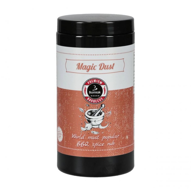 Przyprawa Borniak Magic Dust jest wszechstronnym i aromatycznym dodatkiem, który wzbogaci smak rozmaitych potraw – steków, kebabów, Pulled Pork, Brisket, Ribs, Pastrami, wymagających długotrwałego grillowania lub wędzenia w niższej temperaturze. Ta popularna przyprawa o aromacie BBQ doskonale nadaje się również do dań przygotowywanych na świeżym powietrzu. Komponuje się z domowymi hamburgerami, klopsami lub sosem pomidorowym.