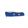 Żeglarski charakter scyzoryka Victorinox Skipper dobitnie podkreślają niebieskie okładziny z motywem róży wiatrów oraz kawałek linki żeglarskiej pełniącej funkcję smyczki.
