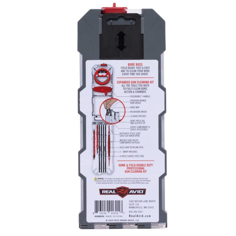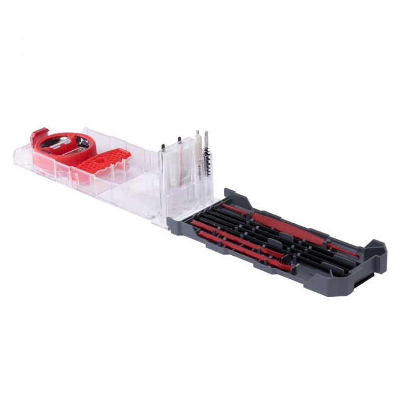 Zestaw do czyszczenia broni Real Avid Gun Boss Multi-Kit oferuje użytkownikowi:Kompleksowy przegląd narzędzi jaki oferuje zestaw do czyszczenia broni Real Avid Gun Boss Pro pozwoli nam na przeprowadzenie pełnej, skutecznej konserwacji naszego karabinka. Skrobaki umożliwiają nam pozbycie się najtrudniejszych zanieczyszczeń bez ryzyka uszkodzenia powierzchni. Nylonowa szczotka prostokątna zagwarantuje wydajne oczyszczenie wnętrza broni ze wstępnie usuniętego nagaru, natomiast dwie szczotki okrągłe pozwolą na skuteczne wyczyszczenie lufy. Dzięki zastosowaniu obrotowej rączki oraz szeregu przedłużek wycior pozwoli na poprawne czyszczenie broni z lufami nawet do 20 cali. Rotacja szczotki zapewnia nam w tym przypadku odpowiednie jej prowadzenie wzdłuż gwintu.