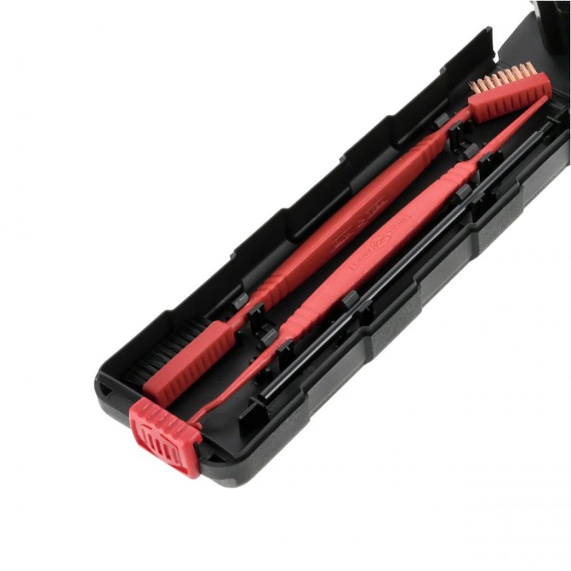 Zestaw do czyszczenia pistoletów i rewolwerów charakteryzuje się niewielkim rozmiarem, dzięki czemu można wygodnie go przenosić w plecaku czy torbie na strzelnicę.
