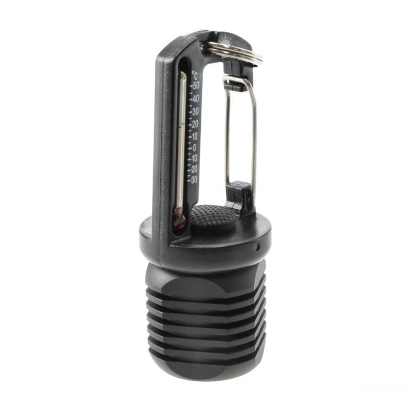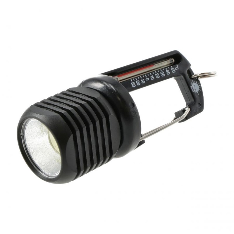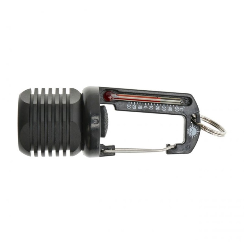 Karabińczyk z termometrem i latarką Sun Co. TempaTorch to przenośne narzędzie outdoorowe, przydatne tak podczas wędrówek, jak i biwakowania.