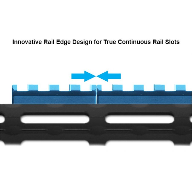 Skrajne zęby szyny są o połowę węższe, dzięki czemu możemy połączyć kilka szyn (jedna za drugą) w jedną monolityczną całość, co znacząco zwiększa funkcjonalność montażu. Szyna ma optymalną wysokość 93 mm, co zapewnia pełną kompatybilność z akcesoriami w standardzie Picatinny.
