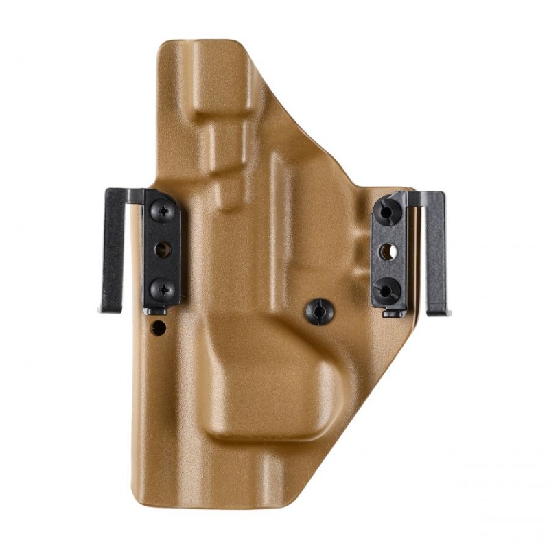 Omawiany model charakteryzuje się konstrukcją typu OWB (Over Waist Band) przeznaczoną do noszenia na zewnętrznej stronie pasa. Kabura tego typu gwarantuje wysoki komfort przenoszenia oraz możliwość szybkiego dobycia. W przypadku chęci wykorzystania w roli kabury EDC konstrukcja skutecznie dociska broń do naszego ciała, pozwalając na dyskretne przenoszenie jej pod obszerną koszulą, marynarką lub kurtką. Kabura OWB doskonale sprawdzi się również w taktycznych lub sportowych konfiguracjach pasa strzeleckiego - skorzystamy z niej zatem zarówno na strzelnicy, jak i w codziennym użytkowaniu. Zwielokrotnione porty montażu szlufek pozwolą nam na ustalenie pionowej pozycji kabury.
