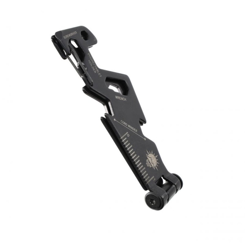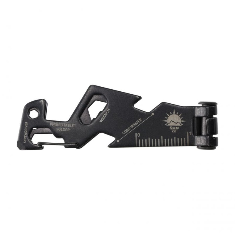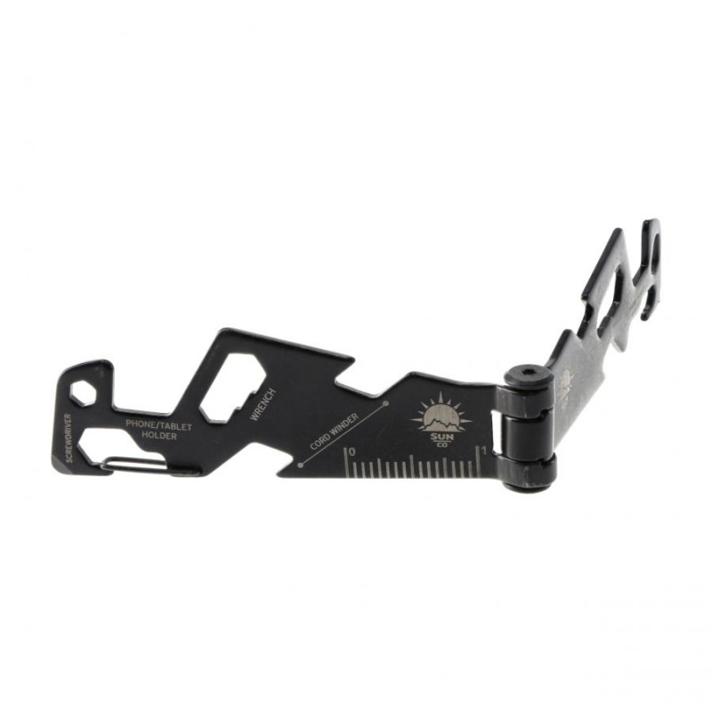 SwingStand firmy Sun Co. to praktyczny, składany multitool zawierający śrubokręty krzyżakowe i płaskie, 6 rozmiarów kluczy sześciokątnych, linijkę centymetrową i calową oraz otwieracz do butelek. Dzięki niewielkiemu karabińczykowi multitool można wygodnie przymocować do plecaka lub kluczy.