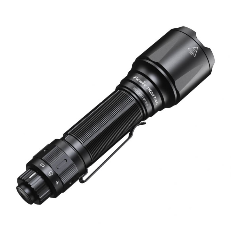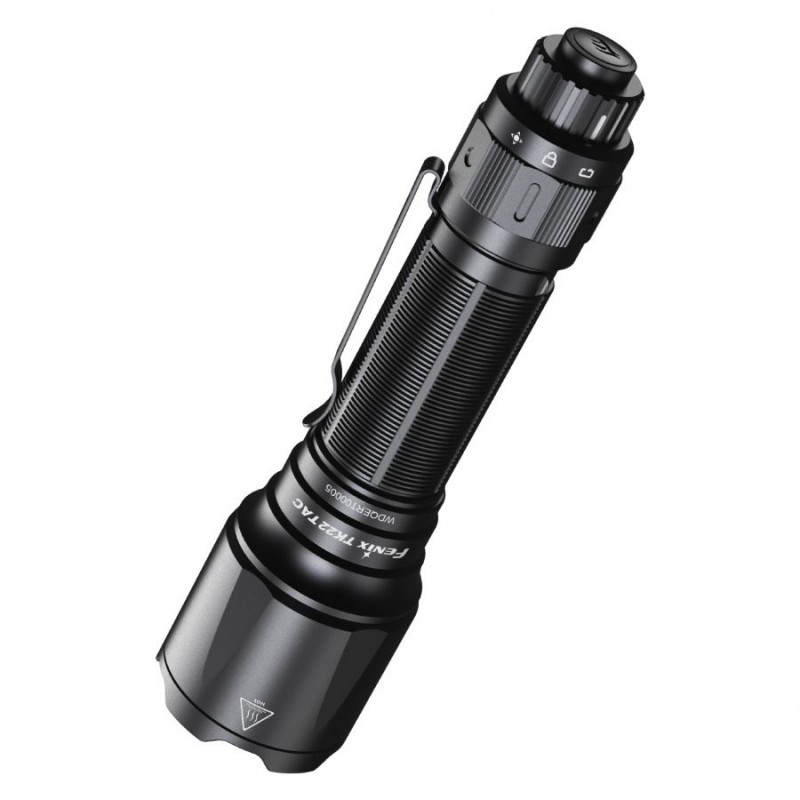 Korpus latarki Fenix TK22 Tac wykonano z hartowanego aluminium A6061-T6, poddanego procesowi twardego anodowania HA-III, dzięki czemu tubus i głowica latarki są odporne na uszkodzenia mechaniczne, zarysowania i wytarcie. Frezowanie korpusu oraz jego geometryczny profil zapobiegają wyślizgiwaniu się latarki z dłoni, oraz zapewniają doskonałą przyczepność. Układ optyczny zabezpiecza zębata korona (podwyższone elementy głowicy), chroniąca szkło w razie upadku lub ustawienia na nierównej powierzchni. W TK22 Tac zastosowano również stalowy klips pozwalający na szybkie mocowania latarki na pasie i oporządzeniu. W latarce zastosowany kilka systemów zabezpieczających m.in. zabezpieczenie przed odwróconą polaryzacją i „inteligentną ochronę” przed przegrzaniem. Wysoka klasa ochrony IP68 powoduje, że latarka jest odporna na całkowite zanurzenie w wodzie (30 minut na głębokości 2 m), pył i zabrudzenie oraz upadek. Odłączany klips zapobiega także stoczeniu się latarki z pochyłej powierzchni. Do obsługi latarki służą tylny włącznik (do aktywacji światła chwilowego i stałego) oraz obrotowy pierścień, którym wygodnie zmieniamy grupy trybów i aktywujemy blokadę.