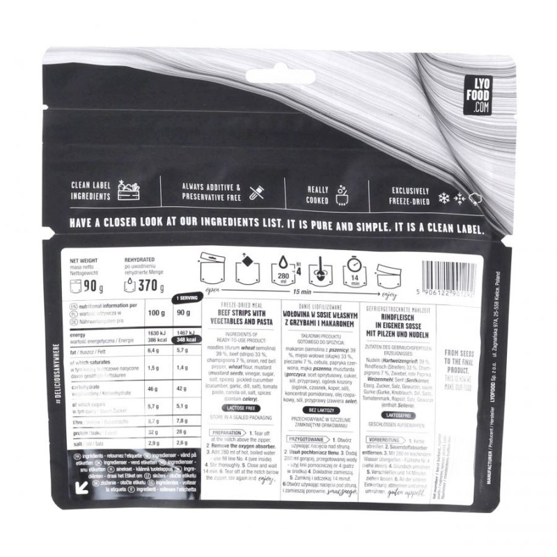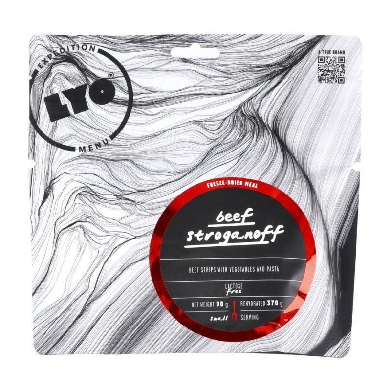 LyoFood Strogonow 370 g to pyszne danie liofilizowane, z kawałkami delikatnej wołowiny, makaronem penne, grzybami i cebulą, przyprawione wg oryginalnej receptury producenta. Porcja zawiera duże kawałki mięsa, pokaźną liczbę kalorii, ma niesamowity smak i aromat co z pewności doceni każdy pasjonat tej rosyjskiej potrawy.