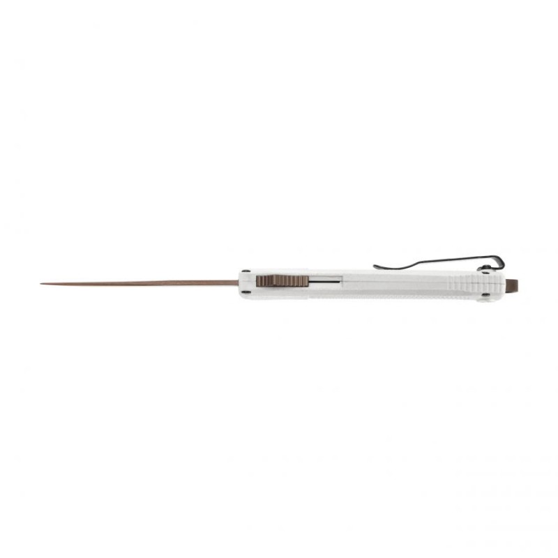 Benchmade Shootout jest nożem automatycznym typu Double Action OTF. Co oznacza, że zarówno proces wysunięcia, jak i schowania ostrza odbywa się automatycznie. Dzięki takiej funkcjonalności nóż można łatwo i szybko rozkładać w warunkach stresu także za pomocą „słabej ręki”. Ostrze rozkładamy poprzez przesunięcie masywnego suwaka do przodu, złożenie wymaga jedynie cofnięcia suwaka w przeciwnym kierunku.