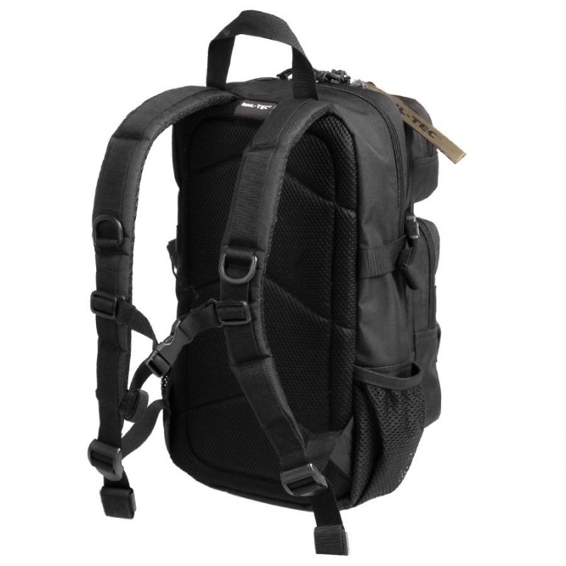 Plecak posiada również dwie boczne kieszonki wykonane z siatki – mogą służyć np. do przenoszenia butelek. W zestawie znajduje się hang-tag z logo Mil-Tec oraz karabińczyk z tworzywa ABS.