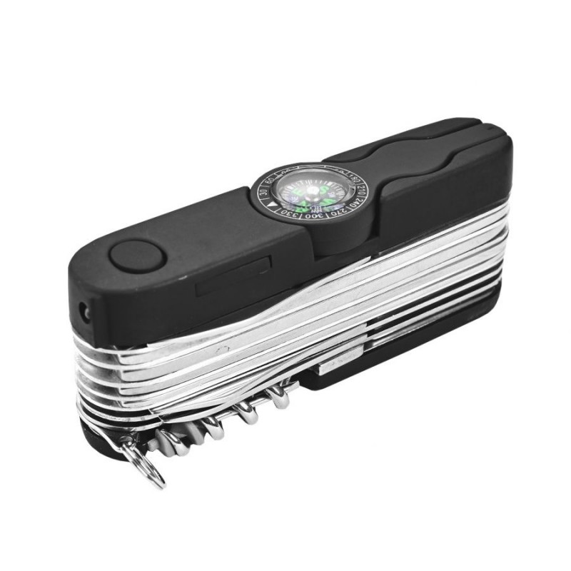 łuskacz do ryb umożliwiający łatwe i szybkie oczyszczenie ryby z łusek. Nie zabrakło również niezbędnych podczas biwaków otwieraczy do butelek i metalowych konserw oraz korkociągu.