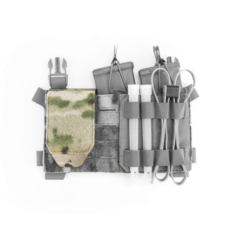 Modułowa wkładka Husar Utility 1/3 MultiCam przeznaczona do mocowania wewnątrz pojedynczej lub podwójnej Klapy Przedniej od firmy Husar, kompatybilna jest również z innymi klapami przednimi do kamizelek taktycznych wyposażonymi w wewnętrzny panel Velcro.