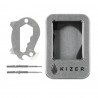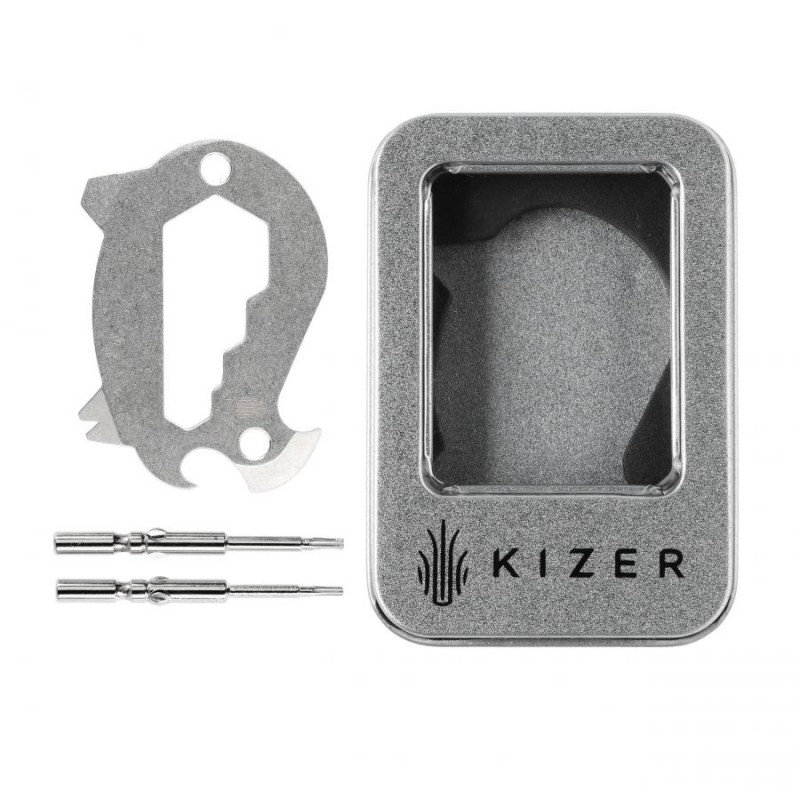 Multitool Kizer Peccary ma jednoczęściową konstrukcję ze stali nierdzewnej wykończoną techniką satynowania. Znajdujące się w zestawie bity można w prosty sposób osadzić w korpusie, tworząc wygodny w obsłudze wkrętak.