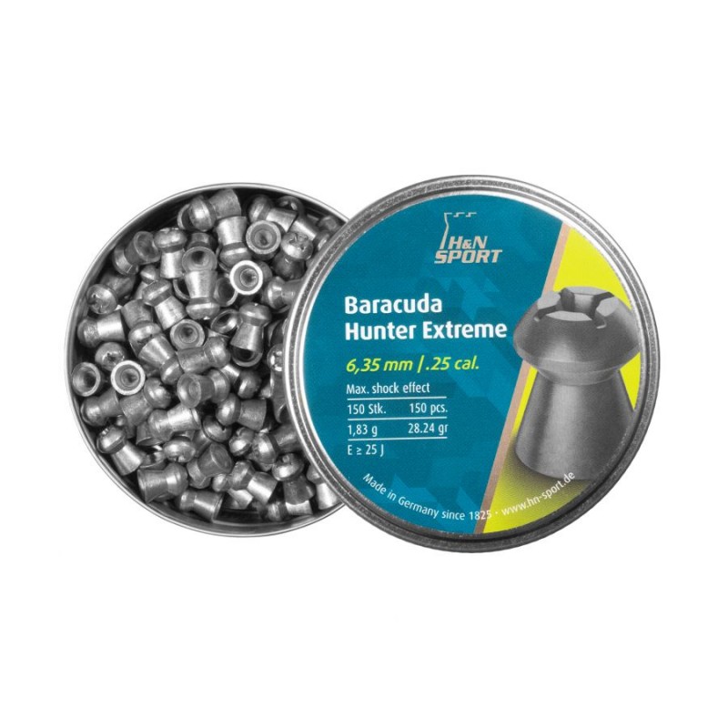 Diabolo H&N Baracuda Hunter Extreme 6,35/150 to ciężki, bardzo precyzyjny śrut do strzelań Field Target oraz długodystansowych. Dzięki krzyżowemu nacięciu na czubku, śrut posiada dużą energię obalającą oraz doskonałą aerodynamikę. Śrut zapewnia doskonałą powtarzalność oraz precyzję strzału, dlatego oprócz strzelania sportowego na zachodzie Europy jest również wykorzystywany do polowań na drobną zwierzynę.