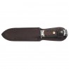 Skaut Venado ma stylową rękojeść z polimeru, wiernie imitującej poroże jelenia. Klasyczny charakter noża podkreślają metalowe okucia, które poprawiają chwyt i zapobiegają wyślizgiwaniu się noża z dłoni. Do przenoszenia noża przy pasie służy pochewka z naturalne skóry, zapinana na metalową napę.
