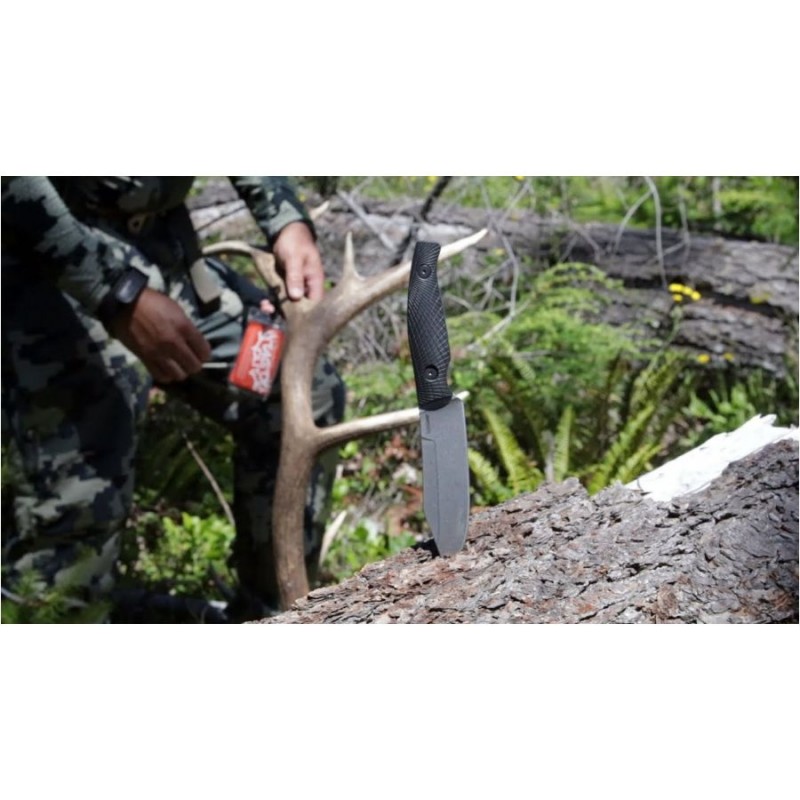 Głownia o typowo roboczym profilu clip-point ma optymalną długość 122 mm i grubość aż 5 mm, dzięki czemu nóż będzie przydatny zarówno do przygotowania posiłku, jak i batonowania drewna. Na fragmencie grzbietu wykonano poprzeczne frezy, zapewniające solidny punkt oparcia dla kciuka.