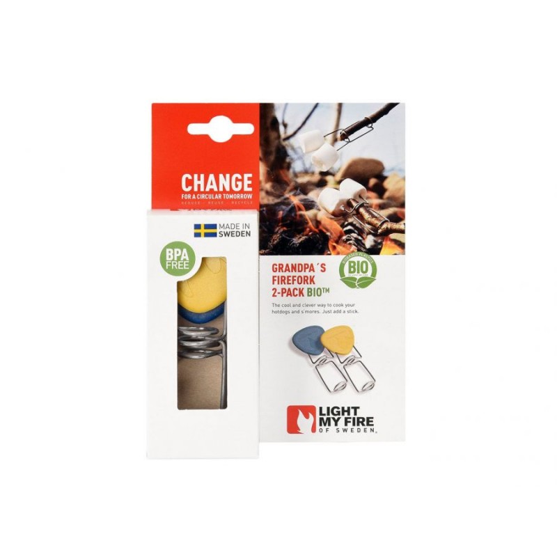 Szpice Light My Fire Grandpa's FireFork wykonano z jednego kawałka drutu nierdzewnego. Po nasadzeniu na patyk pełnią rolę widelca do pieczenia lub pogrzebacza. Szpic ma zagięte końcówki, które solidnie utrzymują mięso lub kiełbasę nad ogniem.