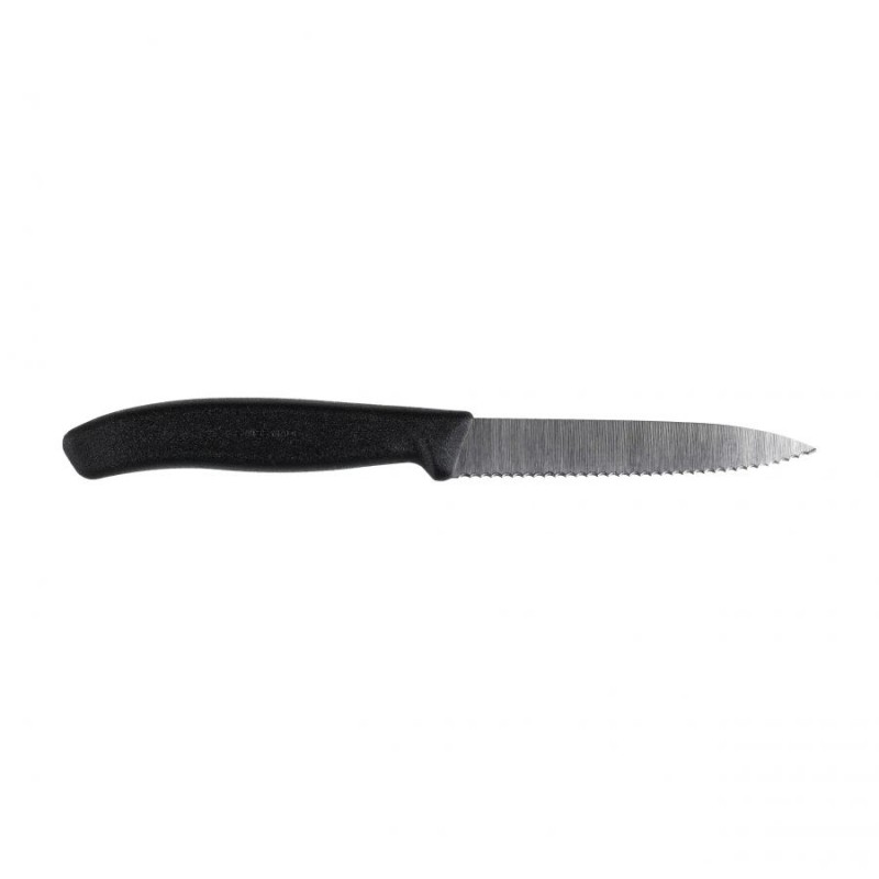Nóż do jarzyn ząbkowany Victorinox z linii Swiss Classic o długości ostrza 100 mm to narzędzie przeznaczone do bezpiecznego i szybkiego krojenia warzyw. Ząbkowane ostrze pozwala na znacznie szybszą pracę oraz umożliwia precyzyjne krojenie nawet twardych jarzyn. Nóż doskonale sprawdzi się zarówno w profesjonalnej gastronomii, jak i w domowej kuchni.