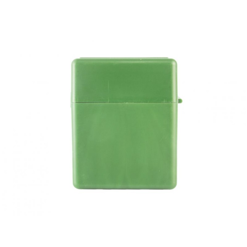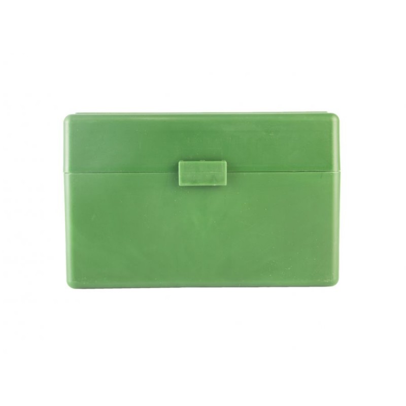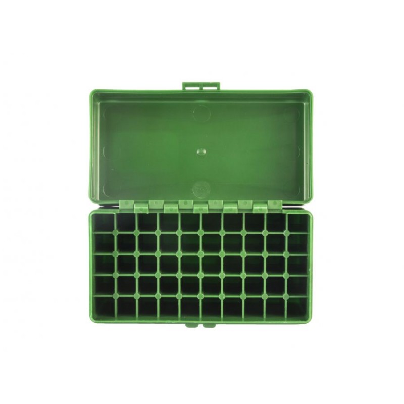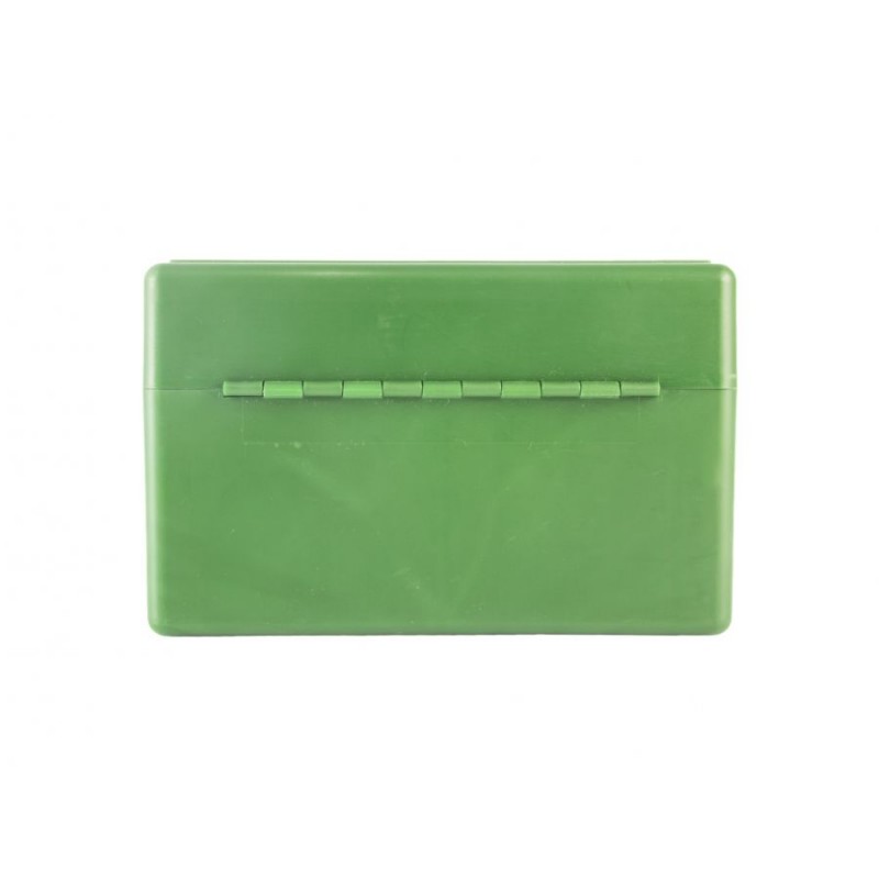 Pudełko na 50 szt naboi karabinowych/sztucerowych kalibru .6,5x55-30-06. Wykonane z twardego tworzywa sztucznego w kolorze zielonym. Niezbędne przy wypadzie na strzelnicę.Zapewnia lepszą ochronę amunicji niż standardowe papierowe opakowania producenta.