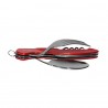 Niezbędnik Fox Outdoor swoją składaną konstrukcją nawiązuje do klasycznego scyzoryka, z tą jednak różnicą, że w niezbędniku oprócz podstawowych narzędzi (otwieracz do puszek i butelek, korkociąg, rozwiertak) znajdują się pełnowymiarowe sztućce tj. łyżka, widelec i nóż. Dodatkowo niezbędnik można w prosty i szybko sposób rozdzielić na dwie części, otrzymując w ten sposób osobny widelec i nóż z łyżką. W tym celu wystarczy rozłożyć otwieracz, pełniący rolę wewnętrznej blokady i rozsunąć niezbędnik wzdłuż własnej osi, Narzędzia oraz sztućce wykonano z polerowanej stali nierdzewnej. Antypoślizgowe, okładziny o wyrazistej kolorystyce, powstały z lotniczego aluminium poddanego procesowi anodowania, co zwiększa odporność na zarysowania i wytarcia.