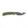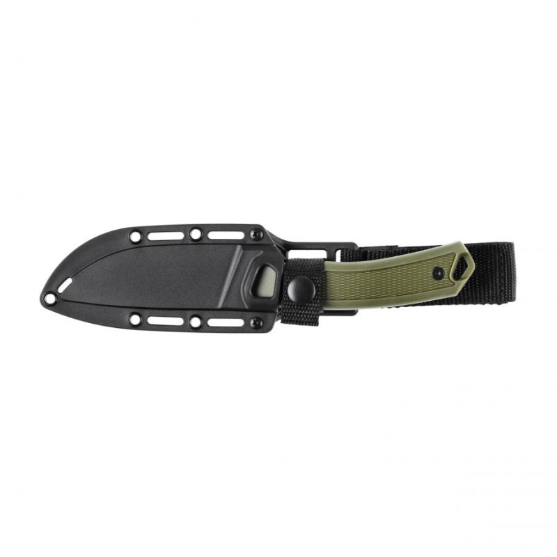 Okładziny z gumowanego polipropylenu zamocowano do trzpienia 2 stalowymi śrubami. Profilowany kształt rękojeści, wycięcie na kciuk oraz kratkowane teksturowanie zapewniają stabilny i wygodny chwyt noża. W tylnej części rękojeści znajduję się otwór, który możemy wykorzystać jako zaczep na smycz lub ogonek z paracordu. W zestawie otrzymujemy solidną pochewkę z polimeru, formowaną metodą wtryskową. Pochewkę można nosić przy pasie, mocować do oporządzenia, a po zastosowaniu dodatkowych taśm (brak w zestawie) wygodnie stabilizować na udzie. Przed wysunięciem lub zgubieniem narzędzia chroni nylonowa taśma zapinana na metalową napę.