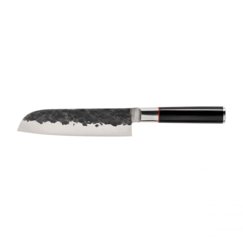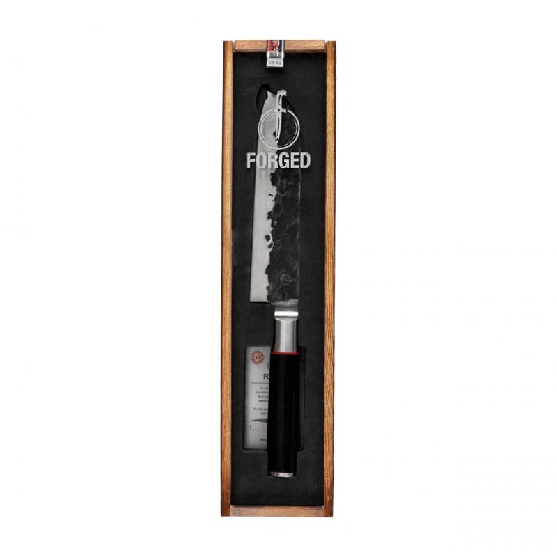 Noże typu Santoku są chętnie wykorzystywane przez szefów kuchni dzięki ich niezwykłej wszechstronności porównywalnej z europejskimi nożami szefa kuchni. Dzięki nieco mniejszym wymiarom pozwalają one na łatwiejsze manewrowanie i ograniczają zmęczenie nadgarstka. Nóż Santoku marki Forged łączy w sobie wszelkie zalety tej formy z zastosowaniem japońskiej stali nierdzewnej zapewniającej dobre trzymanie ostrości połączone z niezwykle łatwym ostrzeniem i świetną odpornością na korozję. Konstrukcję dopełnia przyjemne wzornictwo łączące surową powierzchnię głowni z elegancką, drewnianą rękojeścią.