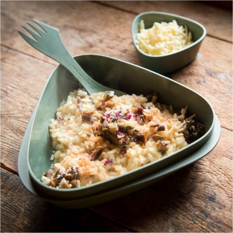 Łyżkowidelec wykonano z biodegradowalnego tworzywa sztucznego na bazie kukurydzy, wolnego od bisfenolu i odpornego na wysoką temperaturę oraz mycie w zmywarkach. Długość 17 cm pozwala także na wygodne spożywanie liofilizatu bezpośrednio z torebki.