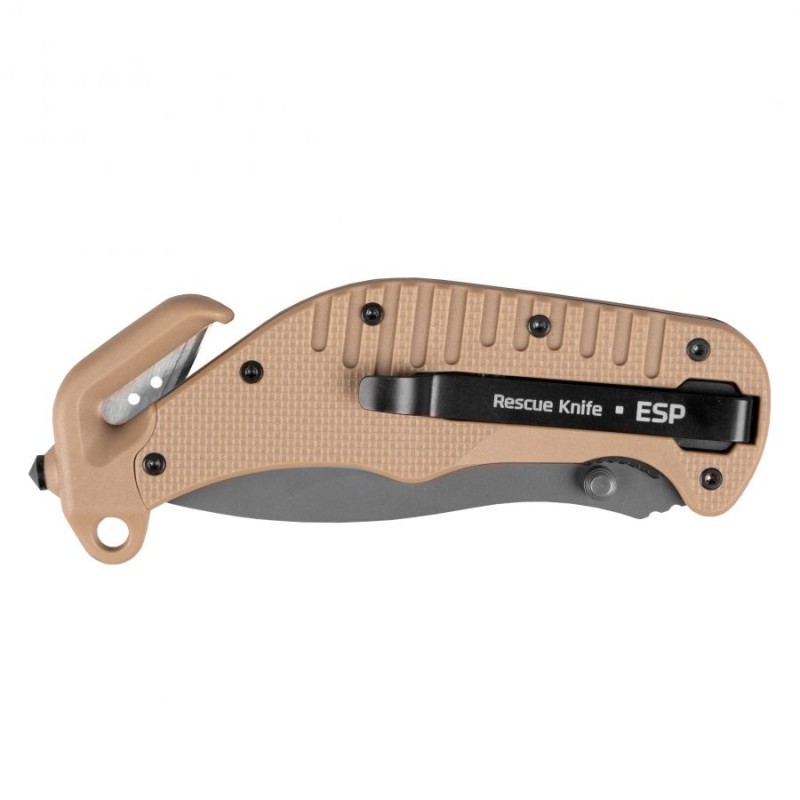 ESP to nóż składany o unikalnej konstrukcji, łączącej cechy standardowego noża, przecinaka do kajdanek tekstylnych oraz narzędzia do awaryjnego rozbijania szyb.