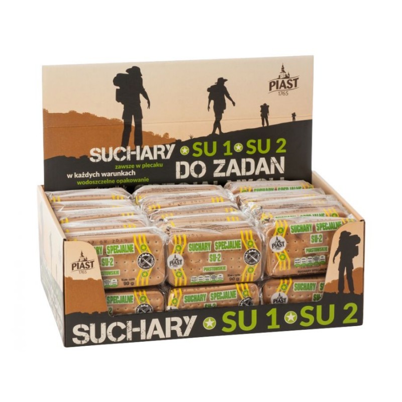 Suchary wojskowe Piast specjalne SU-1 60 op. to pieczywo kminkowe o długim terminie ważności, produkowane według klasycznej wojskowej receptury.