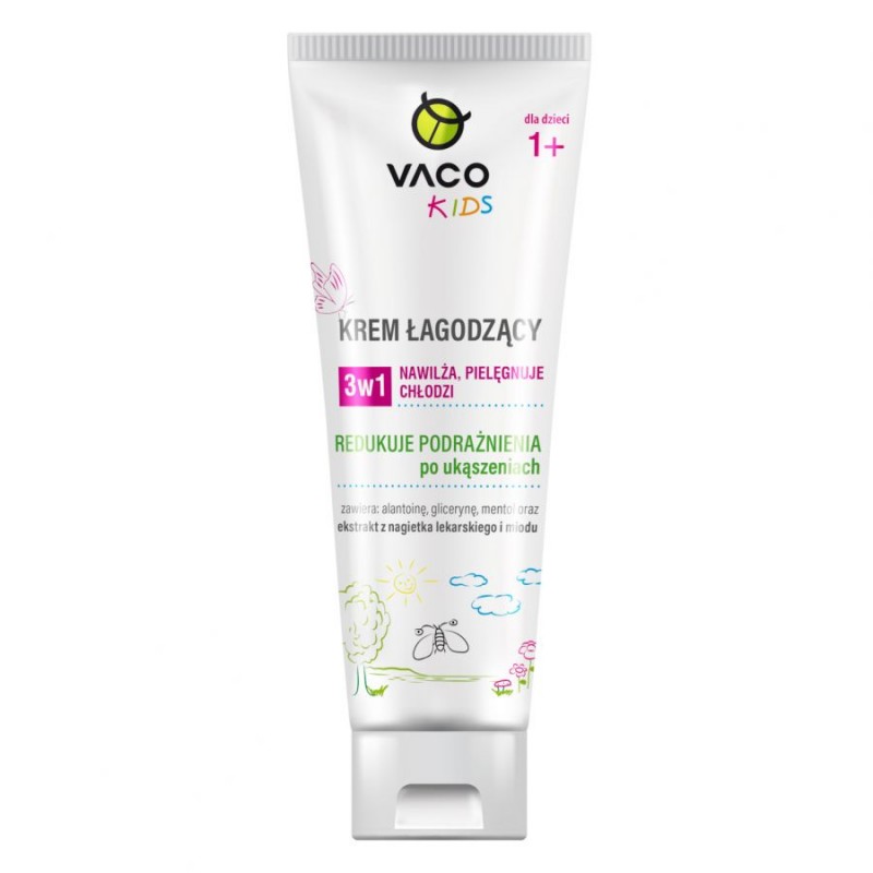 Krem Vaco to łagodzący krem dla dzieci. Dzięki zawartości naturalnego kolagenu działa nawilżająco i ujędrniająco. Kolagen pomaga również zmniejszyć podrażnienia i działa regenerująco, przyspieszając gojenie się skóry. Krem zawiera ponadto działającą przeciwzapalnie alantoinę. Kolejny składnik, mentol, przyjemnie chłodzi i zmniejsza uczucie swędzenia oraz pieczenia.