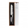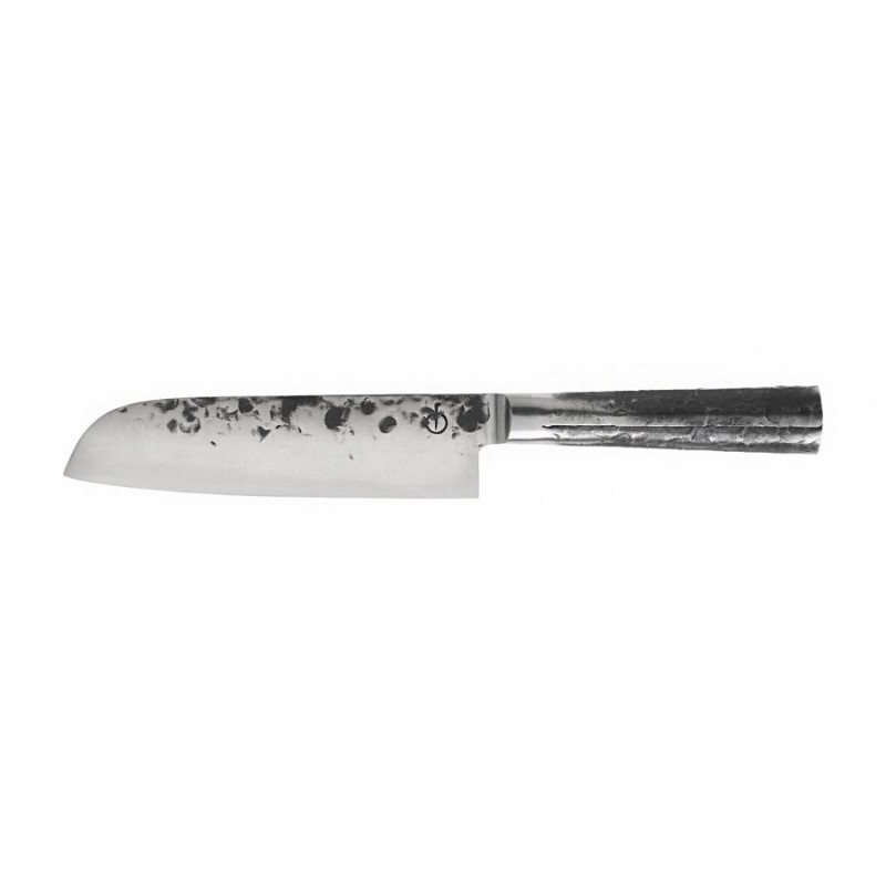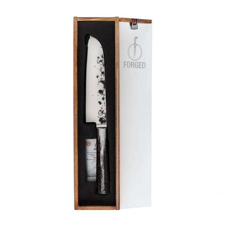 Noże typu Santoku są chętnie wykorzystywane przez szefów kuchni dzięki ich niezwykłej wszechstronności porównywalnej z europejskimi nożami szefa kuchni. Dzięki nieco mniejszym wymiarom pozwalają one na łatwiejsze manewrowanie i ograniczają zmęczenie nadgarstka. Nóż Santoku marki Forged łączy w sobie wszelkie zalety tej formy z zastosowaniem japońskiej stali nierdzewnej zapewniającej dobre trzymanie ostrości połączone z niezwykle łatwym ostrzeniem i świetną odpornością na korozję. Konstrukcję dopełnia stylowe, surowe wzornictwo linii Intense, obejmujące monolityczną konstrukcję wykonaną w całości z jednego kawałka stali.