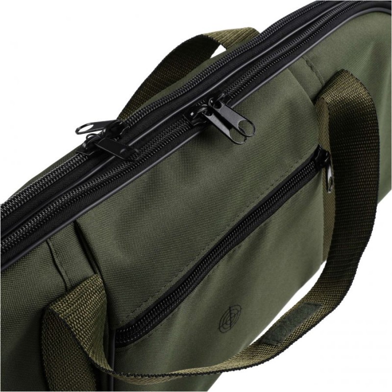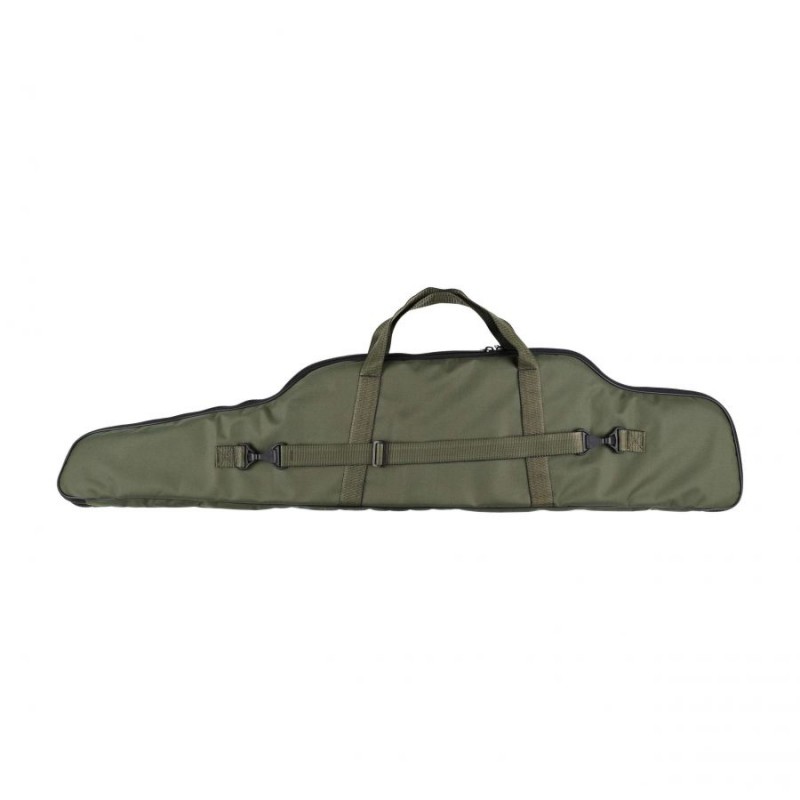 Dzięki długiemu zamkowi błyskawicznemu pokrowiec można rozłożyć i traktować jako matę strzelecką. Podwójny uchwyt oraz regulowany pas z szerokiej taśmy sprawiają, że transport broni nie sprawia najmniejszych problemów.