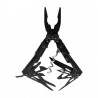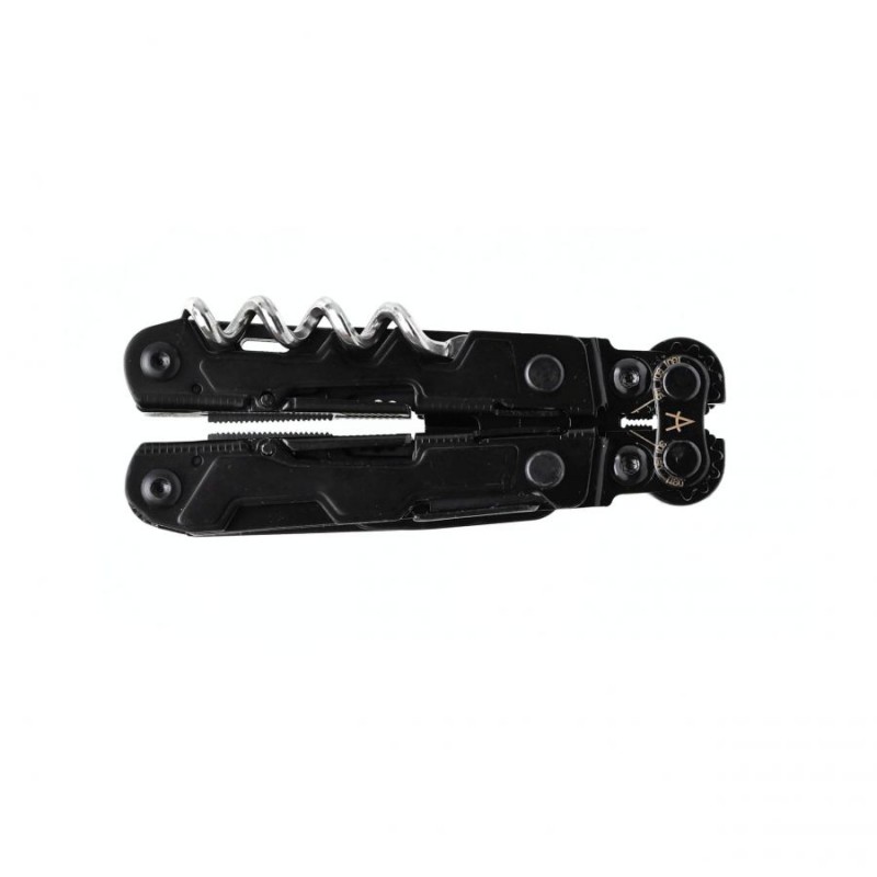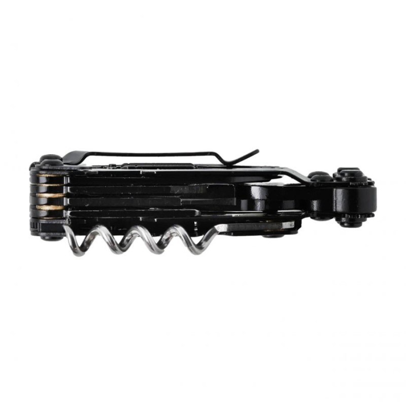 kątomierz, baza do bitów, kombinerki standardowe, korkociąg, linijka cm/in, nożyczki, otwieracz do puszek, otwieracz do butelek, ostrze gładkie, przebijak, przecinak do drutu, przecinak do pasów bezpi