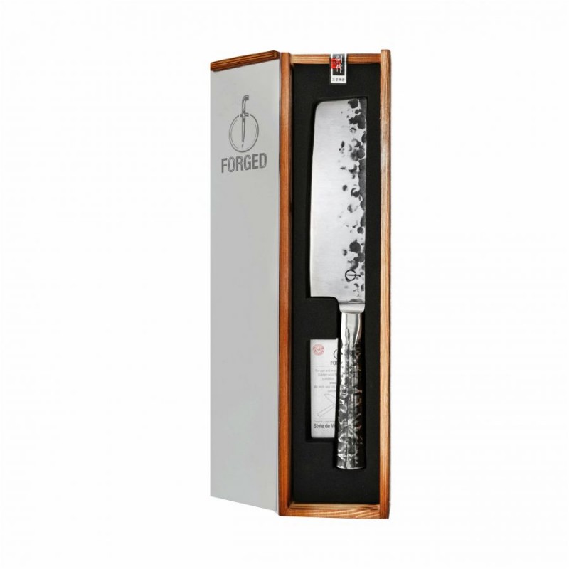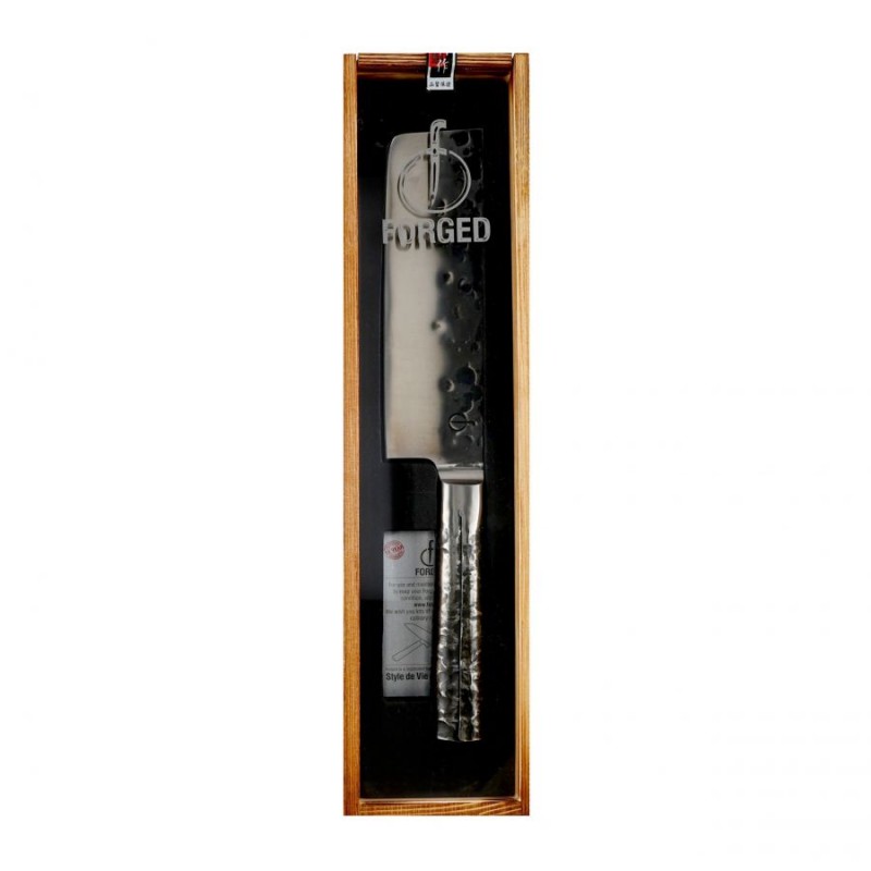 Nóż do warzyw Forged to konstrukcja w stylu nakiri, przeznaczona do dynamicznego siekania, przez co znajdzie zastosowanie przede wszystkim w dłoniach pasjonatów kuchni azjatyckiej. Umiarkowanie wydatny brzuch oraz duża szerokość głowni sprawiają, że nóż doskonale sprawdzi się przy pracy z warzywami oraz ziołami. Skuwana japońska stal nierdzewna przekłada się natomiast na odporność noża na kwaśne środowisko tworzone przez niektóre owoce. Model z linii Intense o surowej, monolitycznej konstrukcji w całości wykonanej przy pomocy kucia.