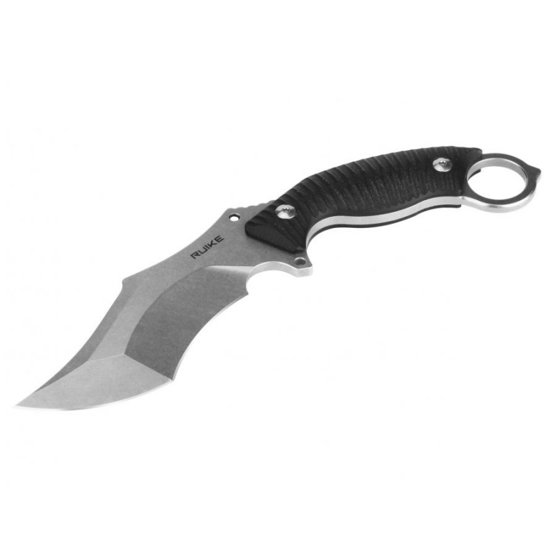 Ruike P181-B to nóż taktyczny typu karambit, wyposażony w stałą głownię ze stali nierdzewnej 14C28N, rękojeść z laminatu G10, charakterystyczny stalowy pierścień oraz polimerową pochewkę z klipsem 360°.