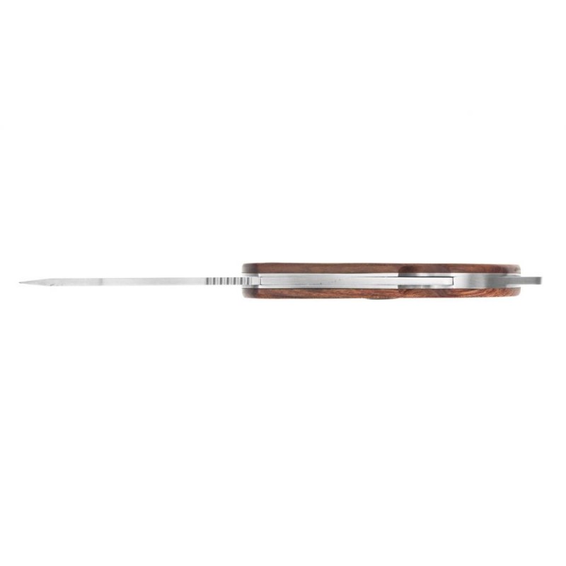 Rękojeść wykonano z selekcjonowanego drewna Bubinga specjalnie profilowanego by pewnie i bezpiecznie nóż trzymał się w dłoni. Z czterech stron rękojeść skręcona jest śrubami na płaski śrubokręt, dzięki czemu łatwo i szybko można go rozkręcić do czyszczenia. Blokada to back lock, dająca 100% zabezpieczenie przed samoistnym złożeniem się ostrza.