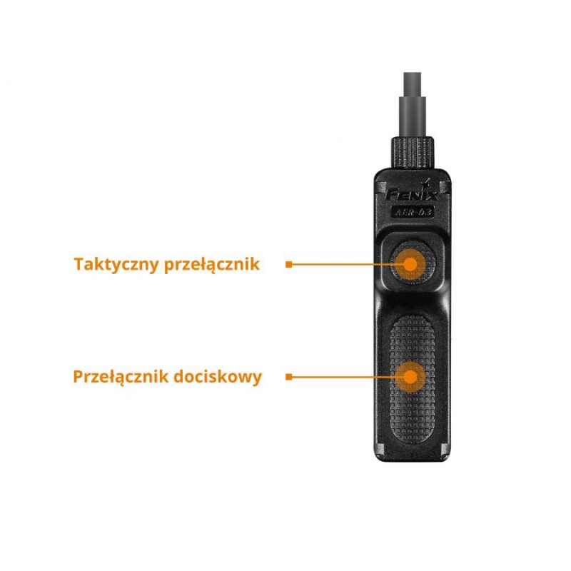 AER-03 V2.0 został wyposażony w dwa przyciski tj. bezgłośny włącznik ciśnieniowy (bez kliku) o dużej czułości do aktywacji światła chwilowego i zmiany trybów oraz okrągły włącznik taktyczny (z klikiem) służący do inicjowania pracy latarki oraz ciągłego świecenia.