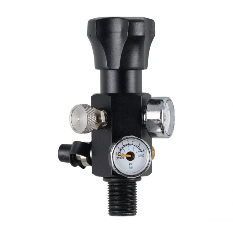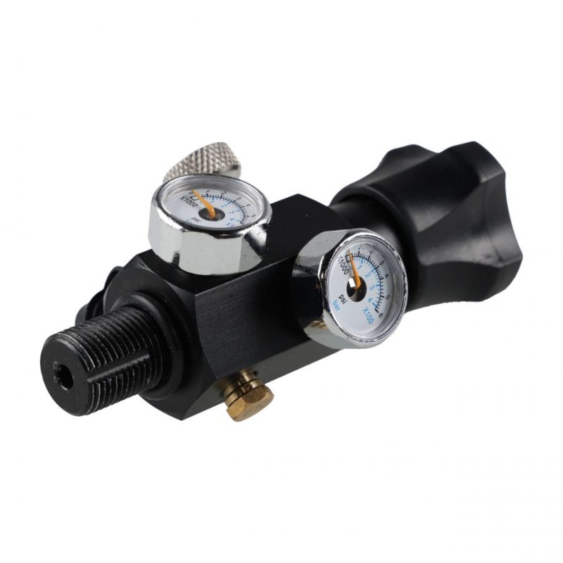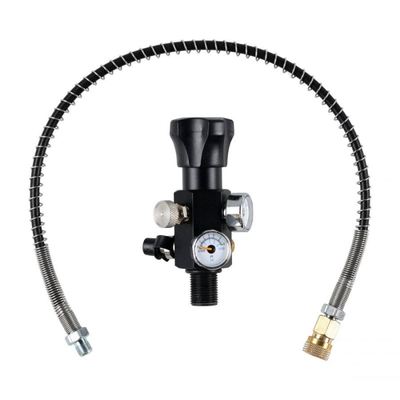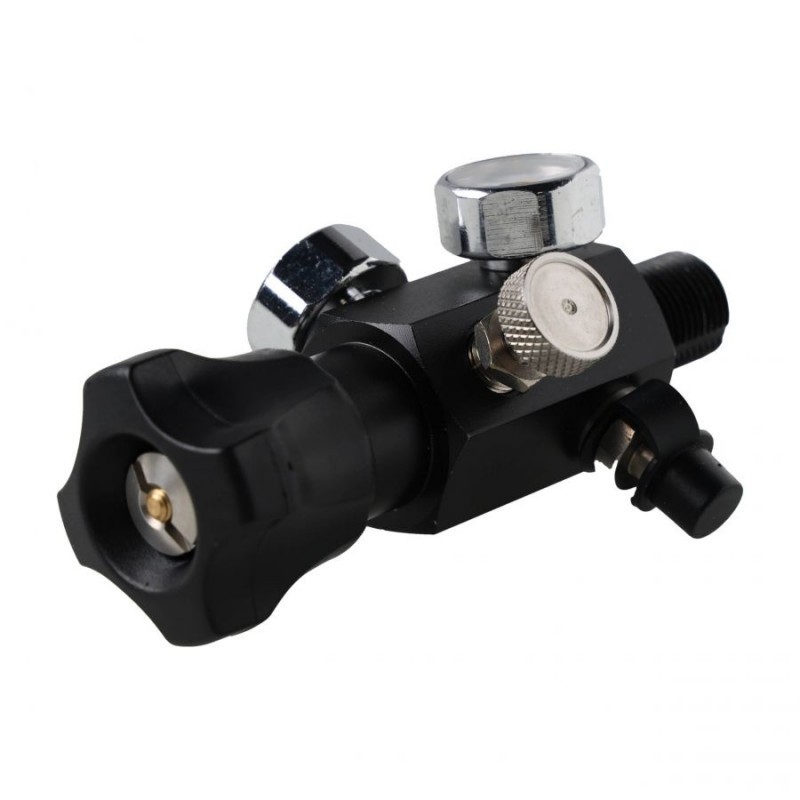 Adapter wyposażono w dwa manometry: jeden pokazuje ciśnienie w zbiorniku, a drugi ciśnienie na linii napełniania. Znajduje się na nim reduktor do regulacji przepływu powietrza oraz śruba awaryjna do spuszczania nadmiaru ciśnienia. Posiada męską szybko-złączkę 8 mm, zabezpieczoną silikonową zatyczką, oraz specjalne pokrętło do spuszczania ciśnienia z wężyka.