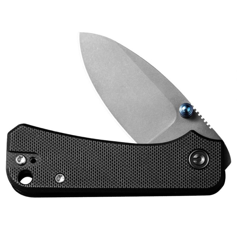Nóż otwiera się za pomocą wykonanego z tytanu kołka pod kciuk.
